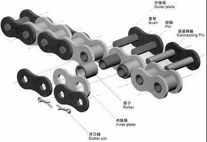 由鏈板、鏈銷、軸套等部件組成;同一品種的鏈條按節(jié)距、排數(shù)、鏈條寬度以及極限拉伸載荷的不同劃分規(guī)格。