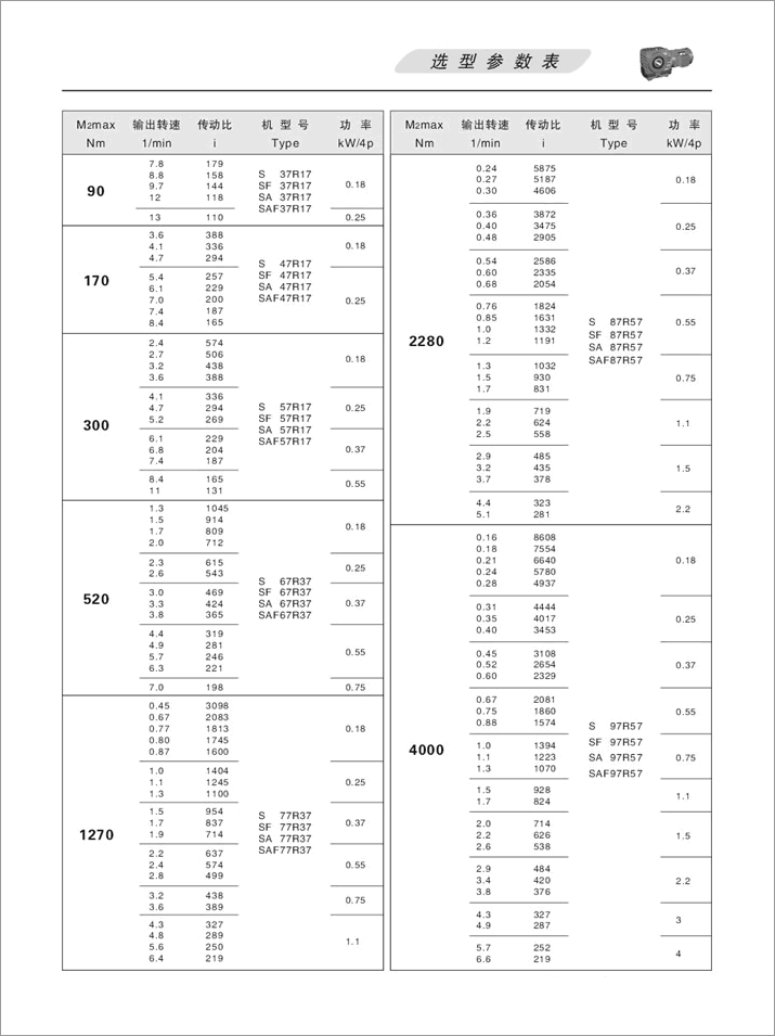 S斜齒輪蝸桿減速機選項參數(shù)表扭矩表(90N.m-4000N.m)