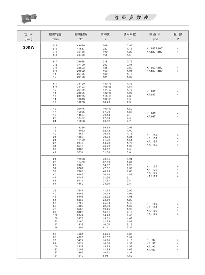 K螺旋錐齒輪減速機選項參數(shù)表30KW