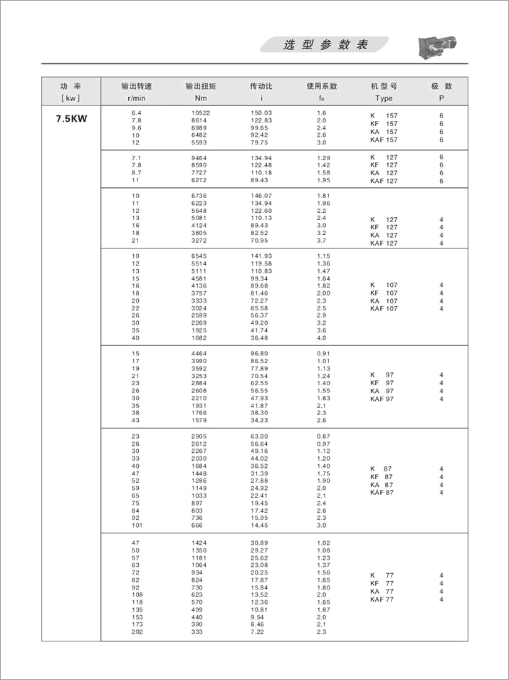 K螺旋錐齒輪減速機選項參數(shù)表7.5KW