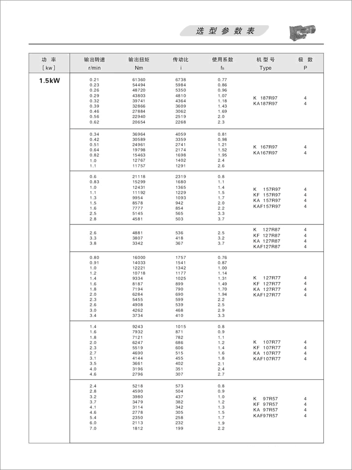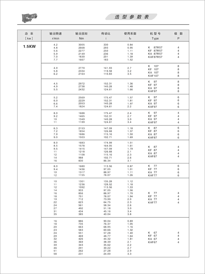 K螺旋錐齒輪減速機選項參數(shù)表1.5KW
