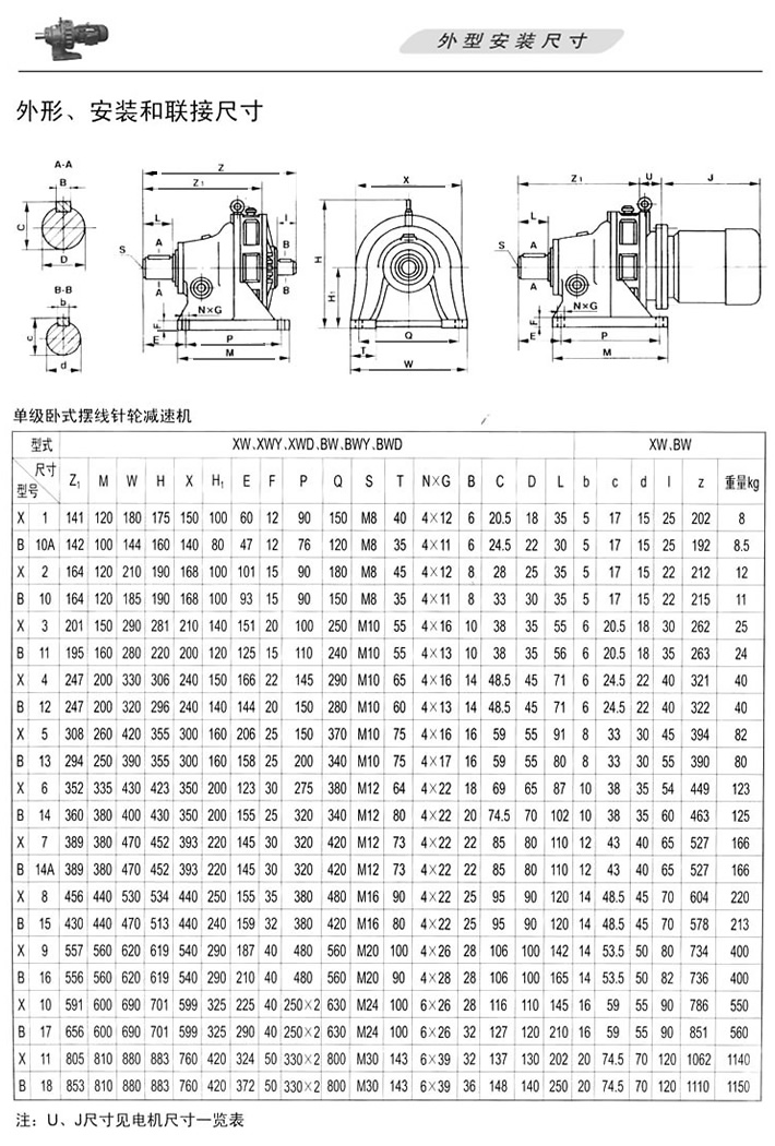 X、B擺線針輪減速機單級臥式減速機外形安裝尺寸